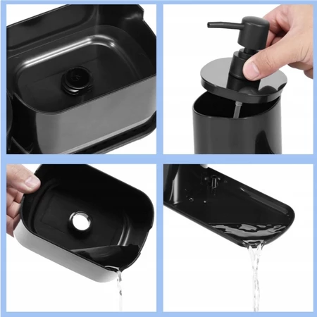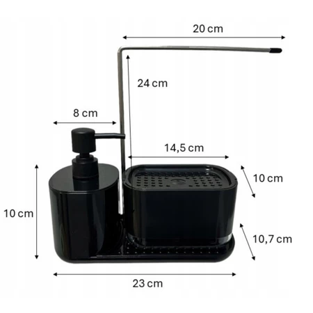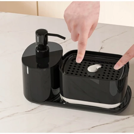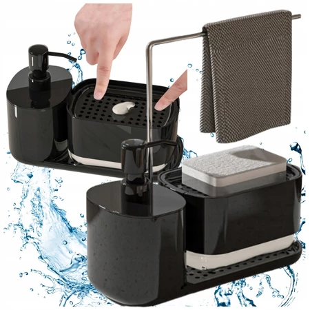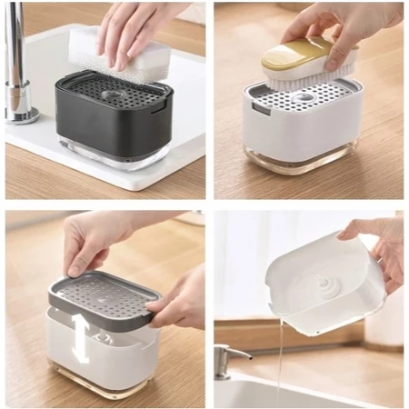 É um organizador de pia multifuncional, que combina dispenser de detergente com suporte para esponja, pano de limpeza e compartimento extra para outros líquidos.