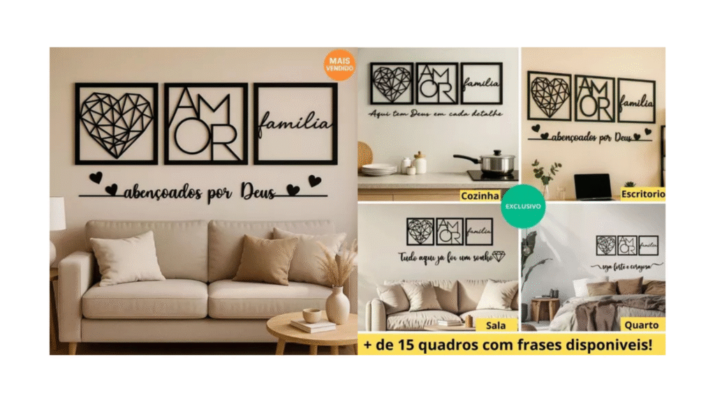 Decorar a casa com estilo sem gastar muito é o desejo de muita gente — especialmente quando buscamos um ambiente mais aconchegante, moderno e com personalidade. Se você sente que sua parede está “sem vida”, que falta charme no quarto ou na sala, e quer transformar o ambiente gastando pouco, o Kit 3 Quadros Cabeceira Família Coração Geométrico + Frase Decorativa pode ser exatamente o que faltava.