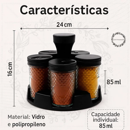 Trata-se de um conjunto composto por 6 potes de vidro transparente, cada um com tampa plástica dosadora, acompanhados de um suporte giratório 360°. O sistema giratório permite acesso rápido aos temperos com apenas um movimento, facilitando muito o preparo das receitas.