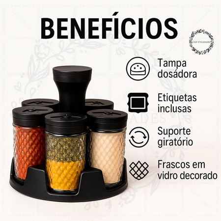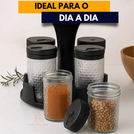 Resumo: Um kit elegante com 6 porta temperos de vidro e suporte giratório 360°, ideal para quem busca organização, fácil acesso aos temperos e um visual moderno, com excelente custo-benefício. ⭐⭐⭐⭐⭐ Nota 4,9/5 — Altíssima aprovação dos compradores