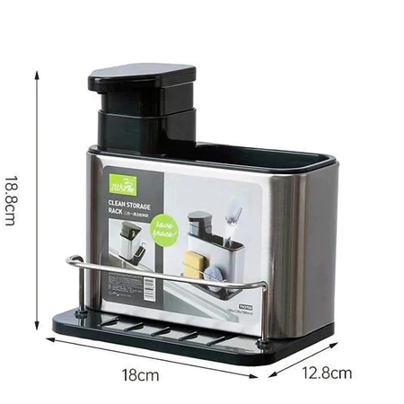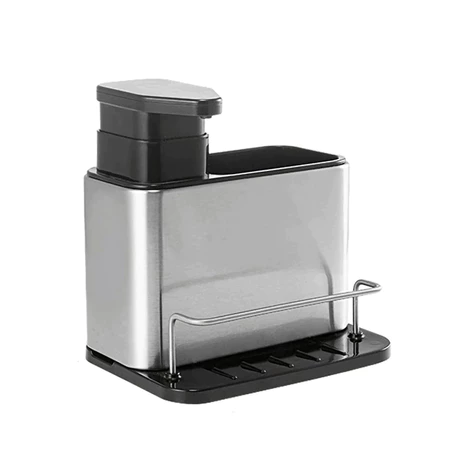 Trata-se de um organizador de pia multifuncional, feito em aço inox de qualidade alimentar, que combina dispenser de detergente com área de escorrimento e compartimentos para esponjas e utensílios.