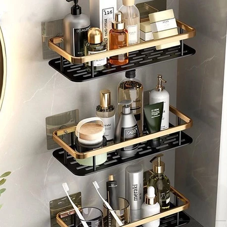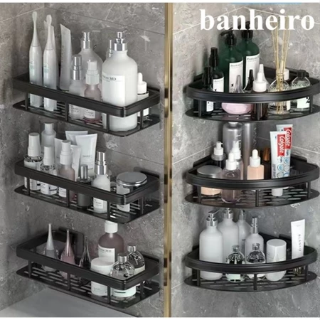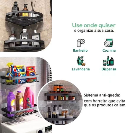 É um conjunto de três prateleiras de canto feitas em alumínio espacial, um material leve, durável e altamente resistente à água e ao desgaste. Elas são ideais para organizar produtos no banheiro, cozinha, lavanderia ou qualquer ambiente que precise de mais espaço vertical — tudo isso sem precisar furar a parede.